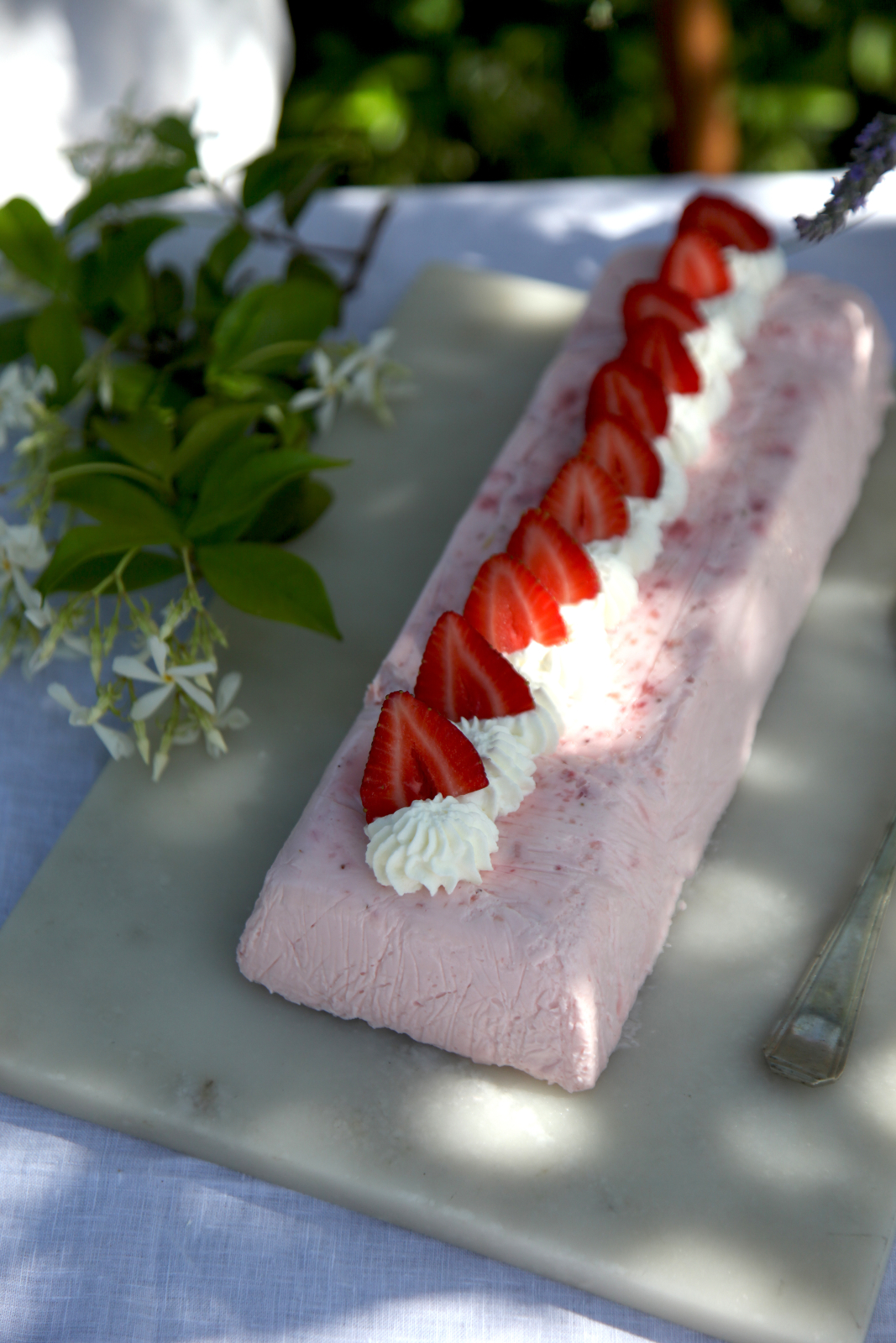 - Στρώνουμε μια μακρόστενη φόρμα με μεμβράνη κουζίνας και αδειάζουμε μέσα το μείγμα. Καλύπτουμε με μεμβράνη η οποία πρέπει να εφάπτεται στην επιφάνεια της κρέμας και αφήνουμε το γλυκό στο ψυγείο για τουλάχιστον 4 ώρες, να πήξει καλά. Όταν είμαι έτοιμο, το ξεφορμάρουμε σε μια πιατέλα και διακοσμούμε με τη σαντιγί που κρατήσαμε στην άκρη και λίγες φρέσκες φράουλες.