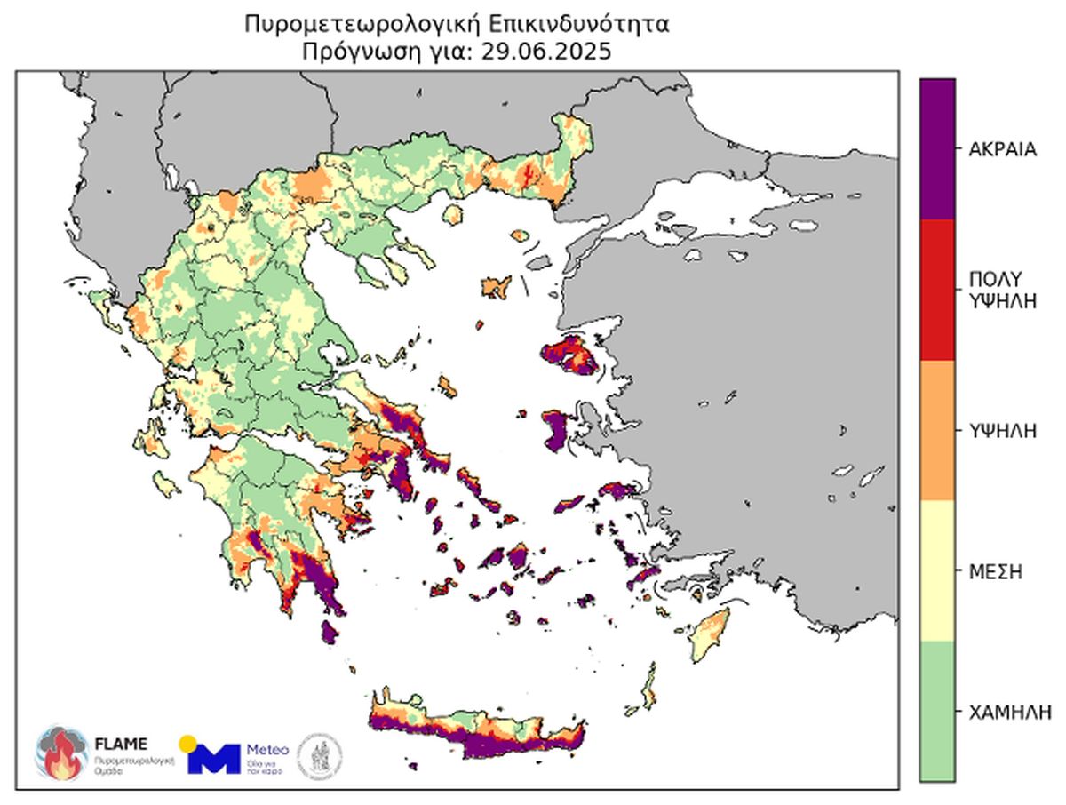 Ακραίος είναι ο κίνδυνος πυρκαγιάς σύμφωνα με τον Χάρτη Πρόβλεψης Κινδύνου Πυρκαγιάς που εκδίδει η Γενική Γραμματεία Πολιτικής Προστασίας.