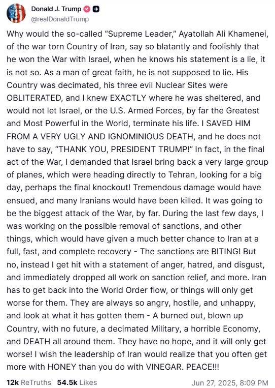Στον επίσημο λογαριασμό του στο X, ο Χαμενεΐ κατηγόρησε τον Τραμπ ότι «υπερβάλλει προκειμένου να συγκαλύψει και να αποκρύψει την αλήθεια», απαντώντας ευθέως στον ισχυρισμό του Τραμπ ότι οι ΗΠΑ «εξαφάνισαν» τις πυρηνικές εγκαταστάσεις του Ιράν. Μέσω της ανάρτησης, ο Χαμενεΐ αντέδρασε επίσης στον προηγούμενο κομπασμό του Τραμπ ότι γλίτωσε τη ζωή του αγιατολάχ κατά τη διάρκεια της πρόσφατης σύγκρουσης Ιράν-Ισραήλ.
