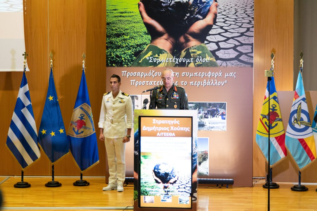 Πρόσθεσε ότι Γάλλοι το λένε «réchauffement climatique» και εξήγησε: «Ακούγεται στα αυτιά ως κάτι το ιδιαίτερα απειλητικό. Οι Ένοπλες Δυνάμεις το προσλαμβάνουν και επιχειρούν ως ενσυνείδητος καταναλωτής πόρων που ανήκουν στην κοινωνία και στην ανθρωπότητα να ελαττώσουν κατά το δυνατόν την κατανάλωση αυτών των πόρων και να προστατεύσουν το περιβάλλον με ολόκληρη σειρά μέτρων και στρατηγικών, από τη μείωση του ενεργειακού αποτυπώματος, από την προστασία των κτηρίων, από τον διαφορετικό σχεδιασμό των ασκήσεων κ.λπ.»