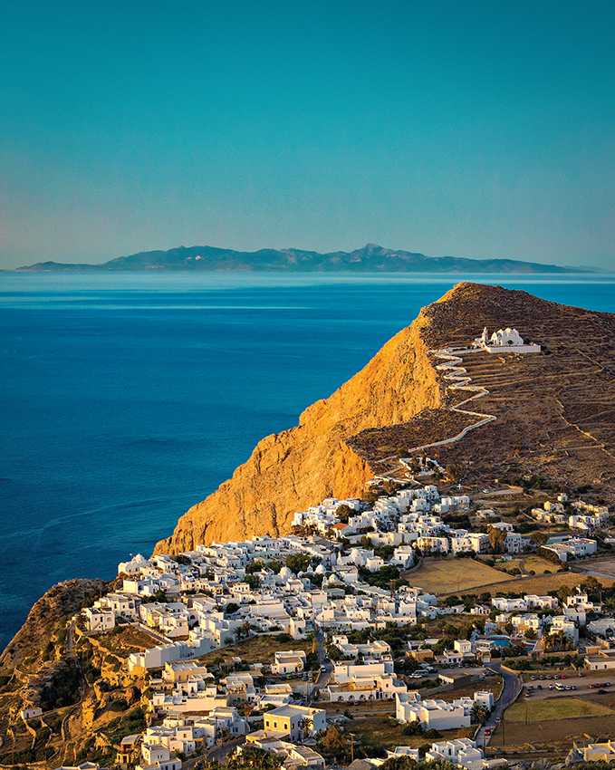 Η Παναγιά της Φολεγάνδρου, αφιερωμένη στην Κοίμηση της Θεοτόκου, σκαρφαλωμένη στο βράχο, δεσπόζει ψηλά στη Χώρα. Φωτό: Ανάργυρος Δεκαβάλλας