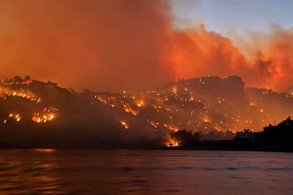 Το πύρινο εκτείνεται σε μεγάλη δασική περιοχή μεταξύ Αγίας Φωτιάς και Σκινοκαψάλων και κατευθύνεται με ταχύτητα προς τα Φέρμα και τη θάλασσα.