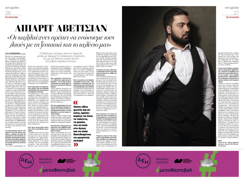 Ο Λιπαρίτ Αβετισιάν, ο διεθνώς καταξιωμένος τενόρος από την Αρμενία, μιλάει αποκλειστικά με αφορμή το ντεμπούτο του με την Εθνική Λυρική Σκηνή στο εμβληματικό Ωδείο Ηρώδου Αττικού, ενώ ο Nobu Matsuhisa, ο κορυφαίος σεφ που σύστησε στον κόσμο την εκλεπτυσμένη ιαπωνική fusion κουζίνα, αποκαλύπτει στο BHMAGAZINO τη δική του φιλοσοφία της πολυτέλειας και μιλάει για τα εστιατόριά του στην Ελλάδα.