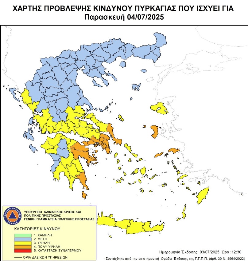 Πολύ υψηλός κίνδυνος πυρκαγιάς (κατηγορία κινδύνου 4) προβλέπεται αύριο, Παρασκευή, σε Αττική, Κύθηρα, Εύβοια, περιοχές της Πελοποννήσου και του Βορείου Αιγαίου, σύμφωνα με το Χάρτη Πρόβλεψης Κινδύνου Πυρκαγιάς, που εκδίδει η γενική γραμματεία Πολιτικής Προστασίας του υπουργείου Κλιματικής Κρίσης και Πολιτικής Προστασίας (civilprotection.gov.gr).