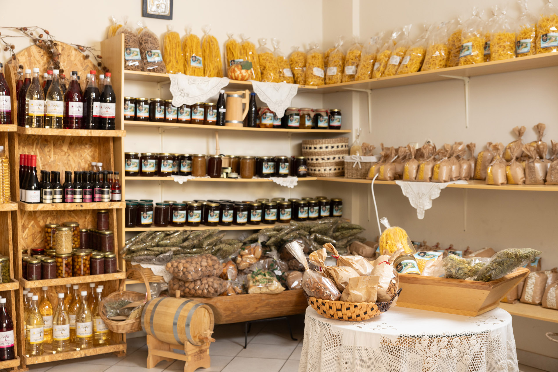 Τα ράφια του μικρού μαγαζιού της Ρούλας είναι γεμάτα χειροποίητα ζυμαρικά, καρύδια, βότανα, αλλά και γλυκά του κουταλιού, όλα τους από τα ευλογημένα προϊόντα της περιοχής. Φωτό: Βασίλης Πολυχρονάκης