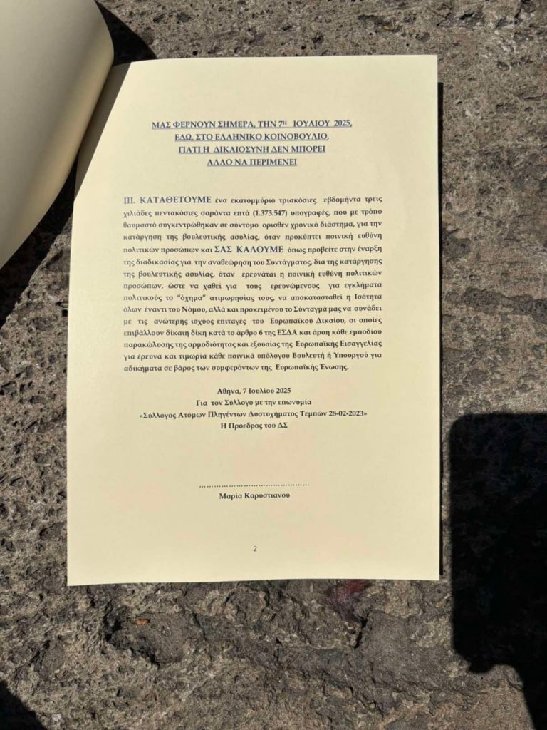 Νωρίς το πρωί της Δευτέρας 7 Ιουλίου, κατέφθασε η Μαρία Καρυστιανού στη Βουλή, προκειμένου να καταθέσεις τις 1,3 εκατομμύρια υπογραφές από τον Σύλλογο Πληγέντων Δυστυχήματος Τεμπών, με αίτημα την αναθεώρηση του Συντάγματος και την κατάργηση της ασυλίας για τις ποινικές ευθύνες των βουλευτών.