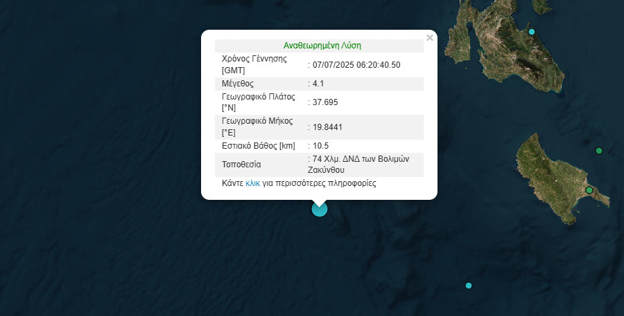 Η σεισμική δόνηση ήταν μεγέθους 4,1 βαθμών της κλίμακας Ρίχτερ, 74 χλμ ΔΝΔ των Βολιμών Ζακύνθου και με εστιακό βάθος 10 χλμ., σύμφωνα με την αναθεωρημένη λύση από το Γεωδυναμικό Ινστιτούτο.