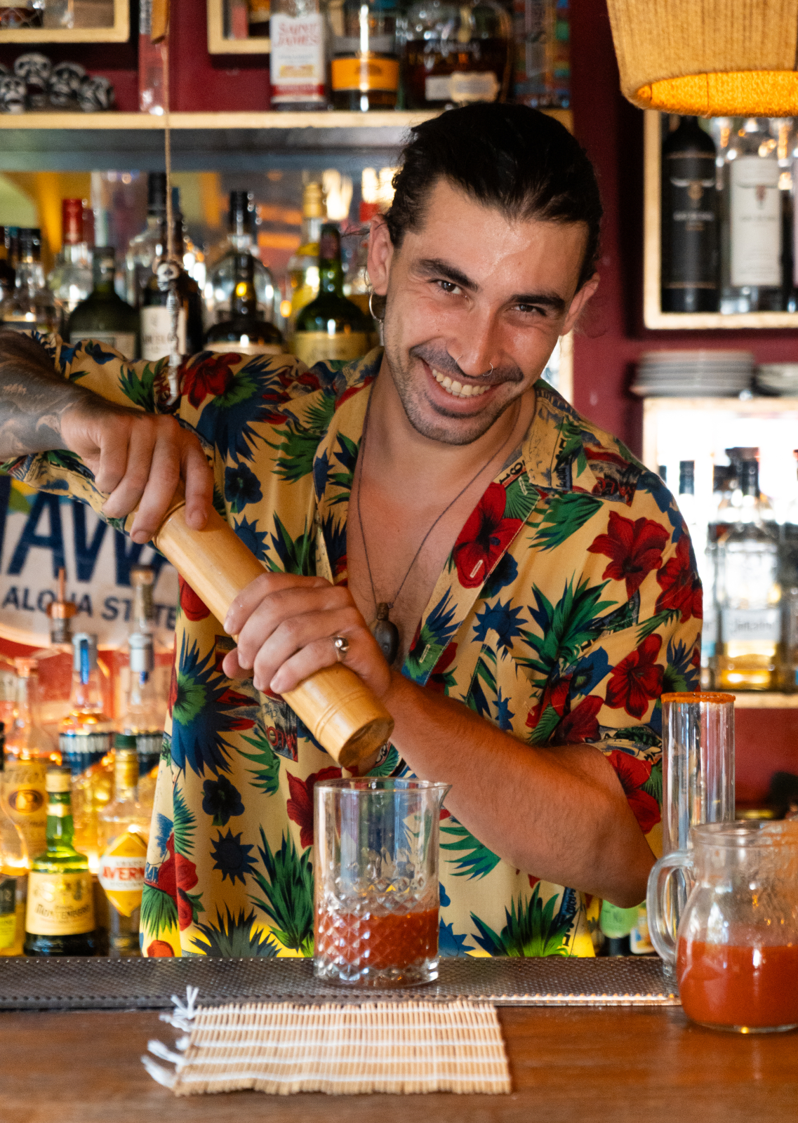 Η προετοιμασία ενός Bloody Mary προϋποθέτει μερικά βασικά υλικά, αλλά και φαντασία που κάνει τη διαφορά. Ο Γιώργος Οικονόμου επί το έργον στο Tiki Bar Athens. Φωτό: Χρήστος Καββούρης