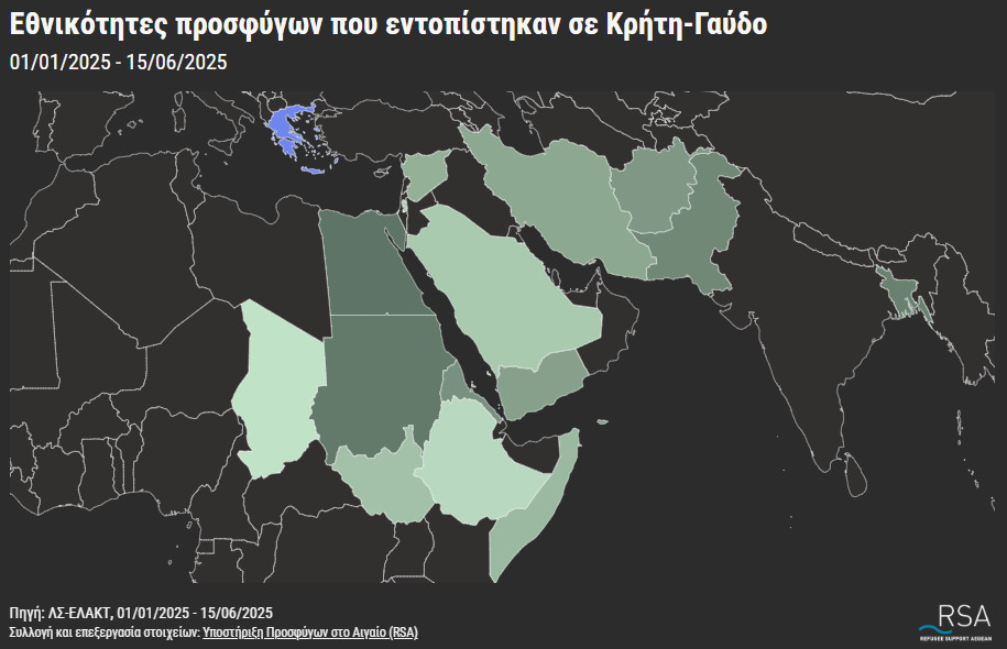Τα στοιχεία αφίξεων προσφύγων στη Γαύδο και την Κρήτη, για το πρώτο εξάμηνο του 2025, δημοσίευσε η οργάνωση «Υποστήριξη Προσφύγων στο Αιγαίο». Από την 1η Ιανουαρίου έως τις 15 Ιουνίου 2025, 7.336 πρόσφυγες και μετανάστες έφτασαν σε Κρήτη και Γαύδο, σε 129 διαφορετικά περιστατικά.