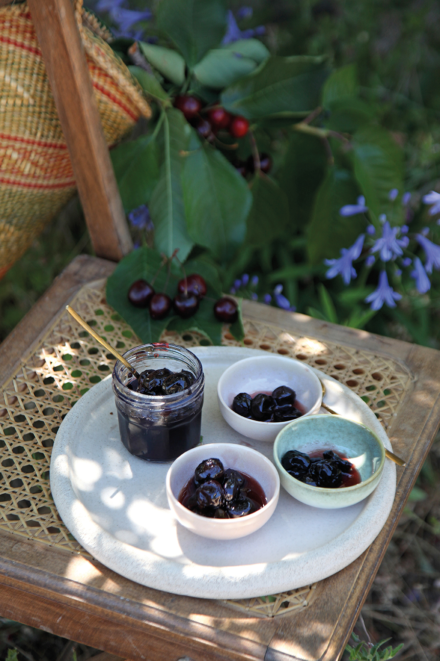 - Πλένουμε τα κεράσια και αφαιρούμε τα κουκούτσια με το ειδικό εργαλείο. Τα βάζουμε σε μια φαρδιά κατσαρόλα μαζί με τη ζάχαρη και το νερό, τα σκεπάζουμε με το καπάκι και τα αφήνουμε στο ψυγείο όλο το βράδυ.