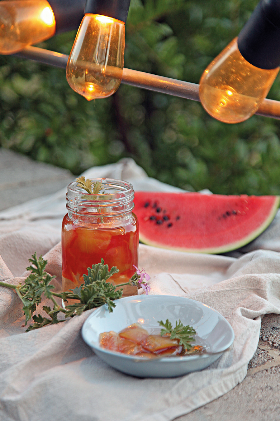 - Κόβουμε το λευκό μέρος με την ελάχιστη κόκκινη ψίχα σε μικρά τετράγωνα τα οποία ρίχνουμε σε ένα μπολ και τα περιχύνουμε με το χυμό από 3 λεμόνια και νερό. Σκεπάζουμε το σκεύος με ένα πιάτο που θα λειτουργεί ως βάρος ώστε όλα τα κομμάτια του καρπουζιού να είναι βυθισμένα στο υγρό και το αφήνουμε στο ψυγείο για 4 ώρες.