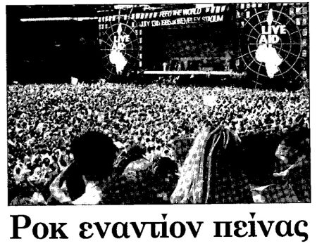 »Έτσι συγκλόνισαν η Αμερικανίδα Τίνα Τέρνερ και ο Άγγλος Μικ Τζάγκερ των Ρόλινγκ Στόουνς, ο Φιλ Κόλινς των Τζένεσις, ο Στινγκ, ο Πωλ Μακ Κάρτνεϋ, οι “U2”, και ο Μπομπ Ντύλαν, που έκλεισε το πρόγραμμα στην Φιλαδέλφεια, με τον κιθαρίστα των “Στόουνς” Κηθ Ρίτσαρντς».