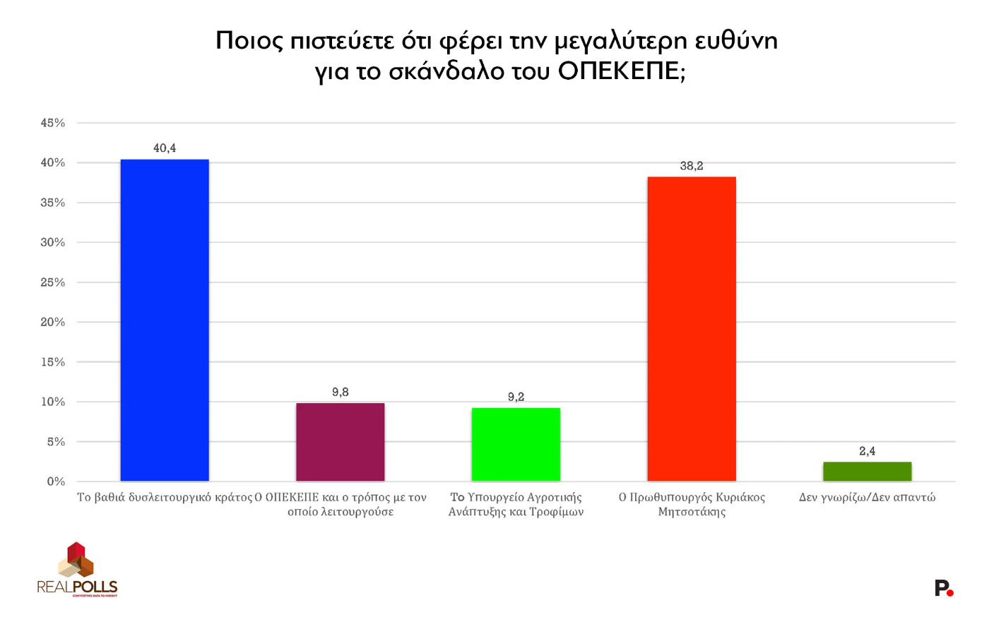 Στο ερώτημα «Ποιος πιστεύετε ότι φέρει τη μεγαλύτερη ευθύνη για το σκάνδαλο του ΟΠΕΚΕΠΕ», η κοινή γνώμη εμφανίζεται μοιρασμένη και πιστεύει ότι κατά 40,4% την ευθύνη φέρει το «βαθιά δυσλειτουργικό κράτος» και κατά 38,2% ο ίδιος ο Πρωθυπουργός.