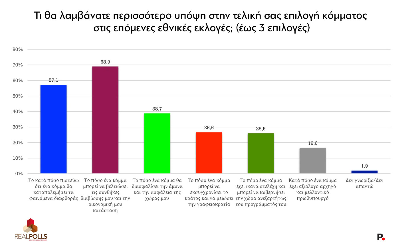 Στην πρώτη θέση των επιλογών εμφανίζεται το κατά πόσο ένα κόμμα μπορεί να βελτιώσει τις συνθήκες διαβίωσης και την οικονομική κατάσταση, με ποσοστό 68,9%. Ακολουθεί το κατά πόσο ένα κόμμα θα καταπολεμήσει τα σκάνδαλα, με ποσοστό 57,1%, και τρίτο θέμα στην ιεράρχηση είναι η άμυνα και η ασφάλεια της χώρας, με 38,7%.