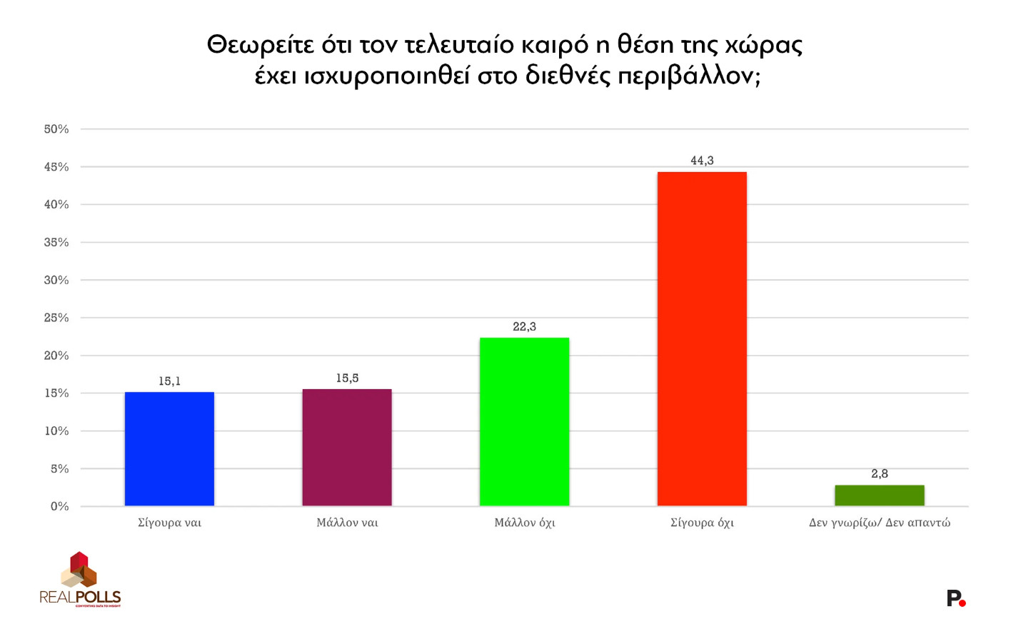 Την ίδια στιγμή, ένα ποσοστό που υπερβαίνει το 66% απαντά αρνητικά στο ερώτημα «θεωρείτε ότι τον τελευταίο καιρό η θέση της χώρας έχει ισχυροποιηθεί στο διεθνές περιβάλλον;»