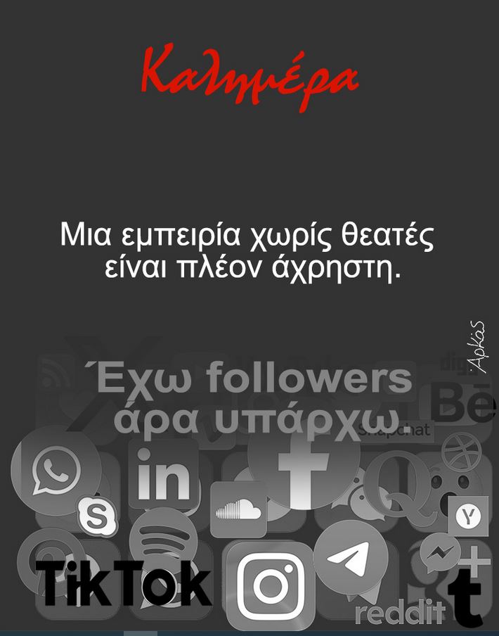 Αιχμηρή «Καλημέρα» μάς απευθύνει ο Αρκάς σήμερα, Τετάρτη 16 Ιουλίου 2025. Ο γνωστός σκιτσογράφος θίγει το θέμα των social media, της χρήσης τους αλλά και την ανάγκη που καλύπτουν ή διαμορφώνουν σε κάποιους από τους χρήστες τους.