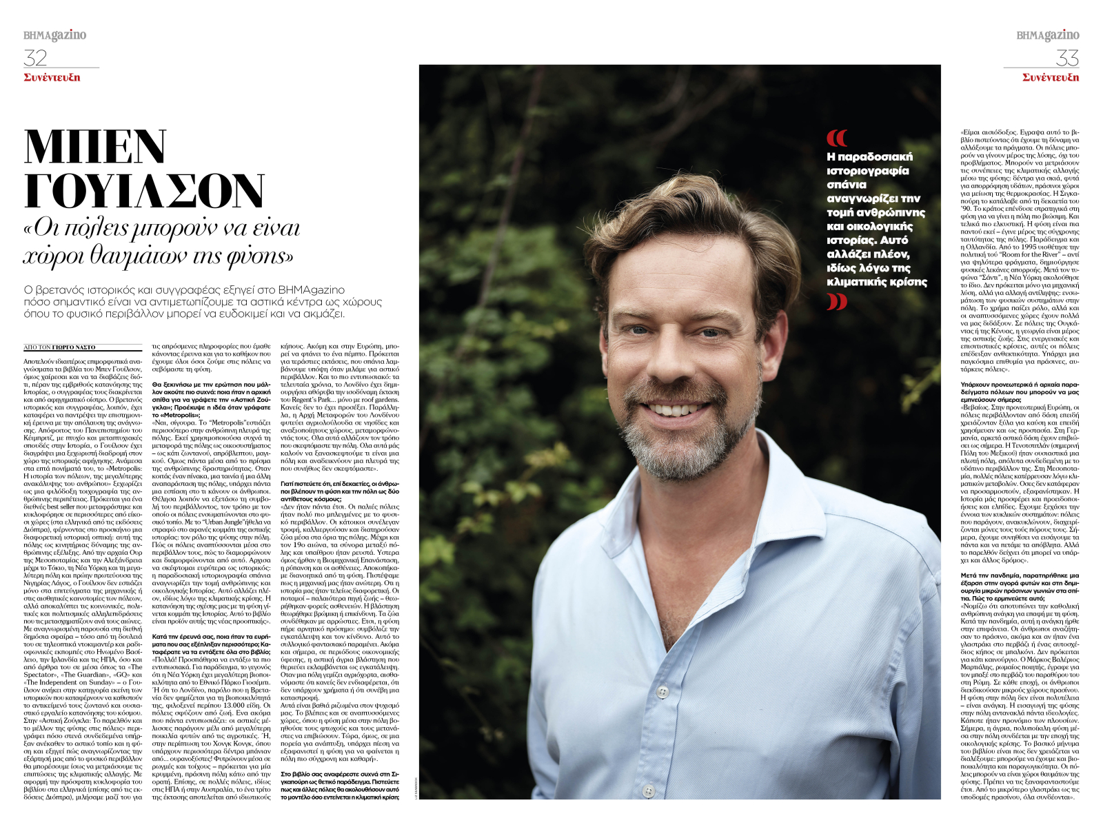 Ο Μπεν Γουίλσον, ο βρετανός ιστορικός και συγγραφέας εξηγεί στο ΒΗΜΑGAZINO πόσο σημαντικό είναι να αντιμετωπίζουμε τα αστικά κέντρα ως χώρους όπου το φυσικό περιβάλλον μπορεί να ακμάζει.