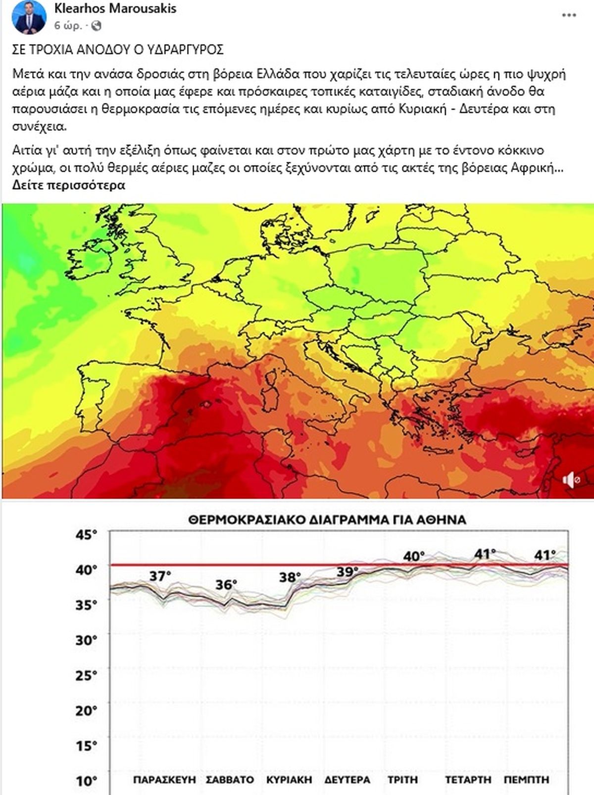 Πιο συγκεκριμένα, προσθέτει, το 2023 ζήσαμε το μακροβιότερο καύσωνα στην Ελλάδα 13/7 -27/7/23 (14 ημέρες ) και μάλιστα στις 23/7/23 στο Γύθειο καταγράφηκε η 6η μεγαλύτερη θερμοκρασία όλων των εποχών με τιμή 46,4 °C. Ο καύσωνας που έρχεται δεν έχει καμιά σχέση με αυτόν.