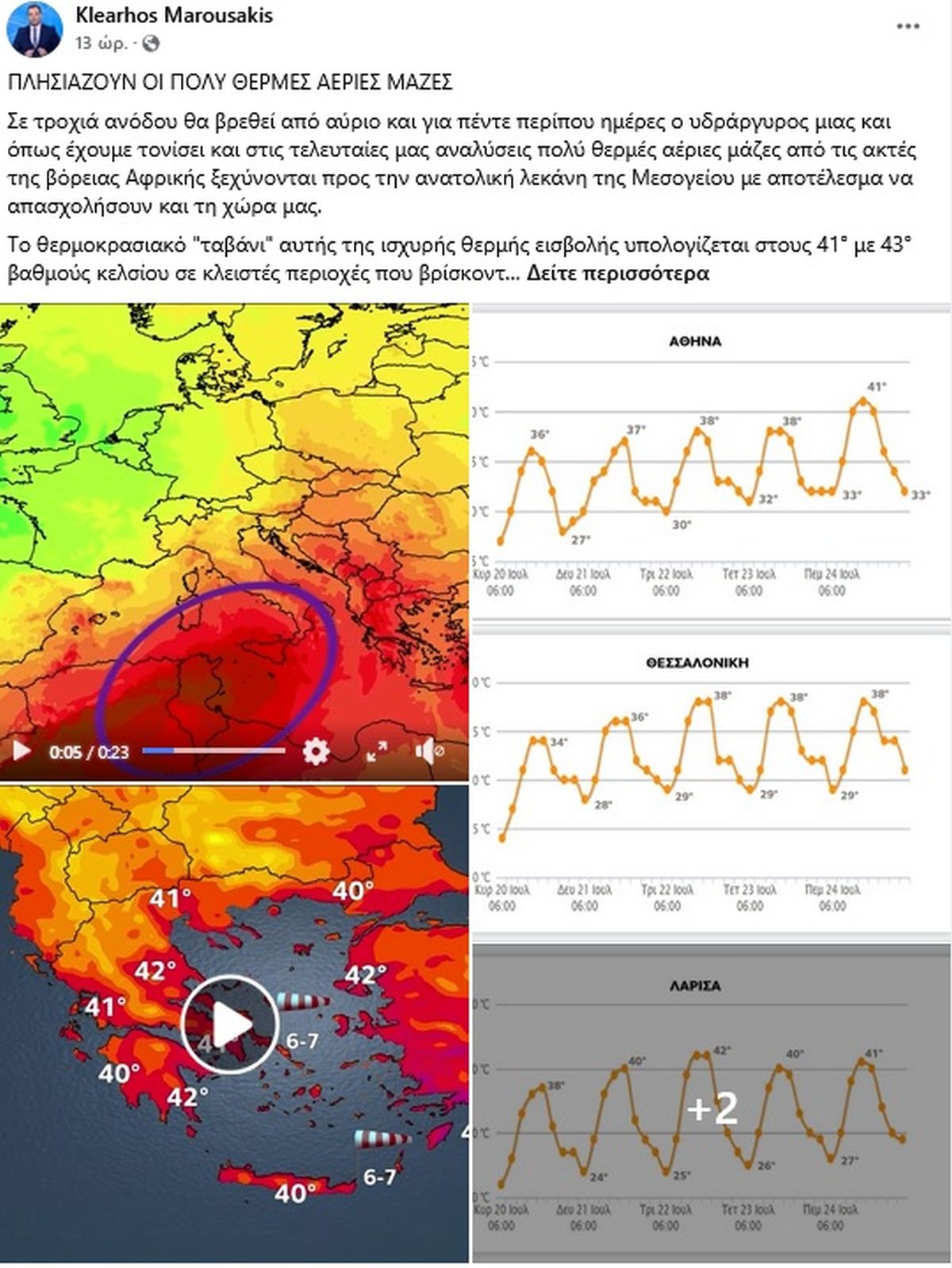 «Το σημαντικότερο πρόβλημα αυτού του κύματος καύσωνα, θα είναι οι υψηλές ελάχιστες θερμοκρασίες και με έμφαση τις μεγάλες πόλεις όπου ο υδράργυρος δεν θα πέφτει εύκολα κάτω από τους 30° με 32° βαθμούς. Στην ύπαιθρο τα πράγματα θα είναι σαφώς καλύτερα» αναφέρει σε ανάρτησή του ο Κλέαρχος Μαρουσάκης.