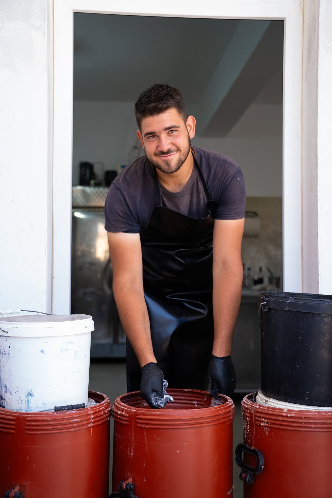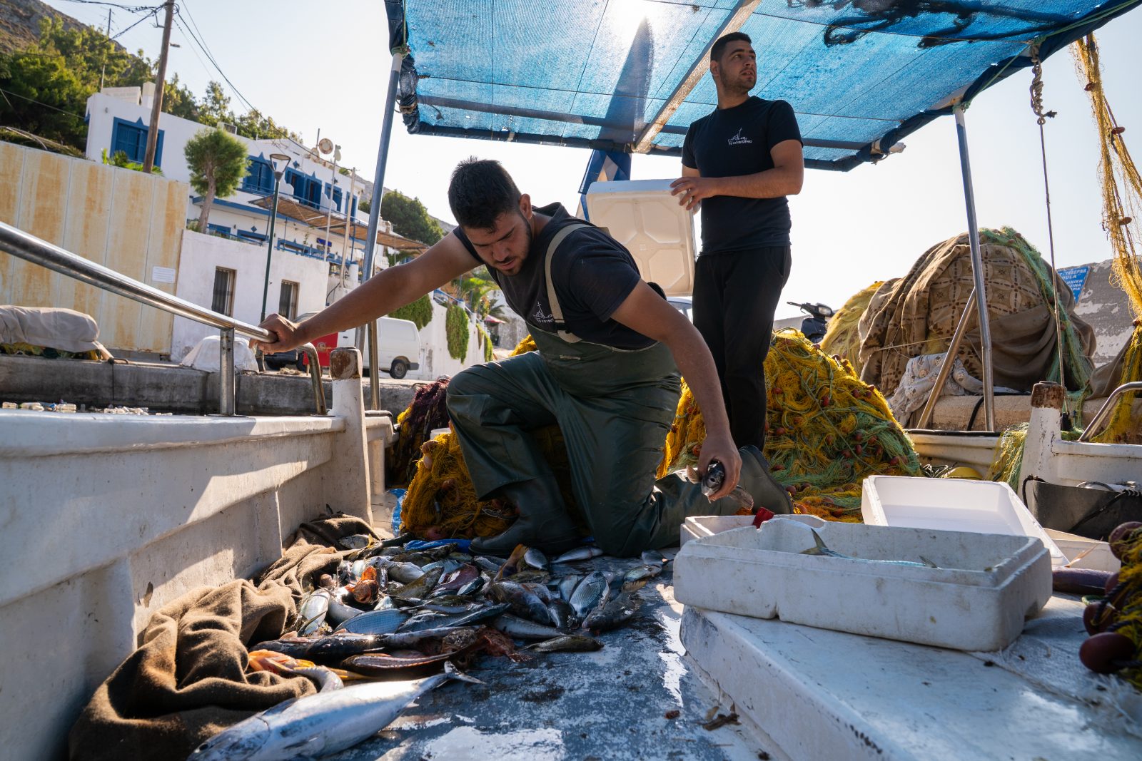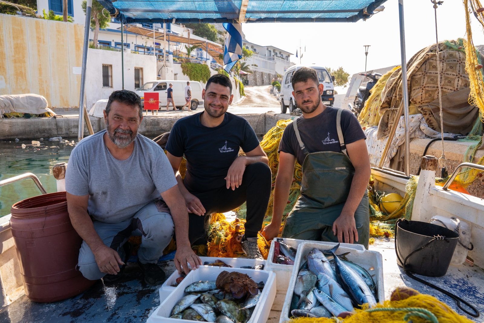 Όταν τους συναντήσαμε στο λιμανάκι, στο Παντέλι, είχαν μόλις γυρίσει από τα ανοιχτά και ξεδιάλεγαν τα ψάρια τους. Άλλα θα τα πουλούσαν, άλλα θα τα κρατούσαν για δική τους χρήση και τα πιο μικρά θα τα μάζευε ο Γιώργος για να ταΐσει μια στρατιά από γάτες που τον έχουν μάθει και τον ακολουθούν σε κάθε του βήμα. Μετά, ανεβήκαμε στη θέση Σπηλιά, εκεί όπου είναι το σπίτι τους αλλά και το παραδοσιακό εργαστήριο για αλίπαστα που άνοιξαν πρόσφατα. Η ιδέα για να επεξεργάζονται τις ψαριές τους και να δημιουργήσουν ένα νέο προϊόν ήταν του Μάριου, ο οποίος εκτίμησε καλά την παλιά συνταγή του παππού που είχε ο Γιώργος.