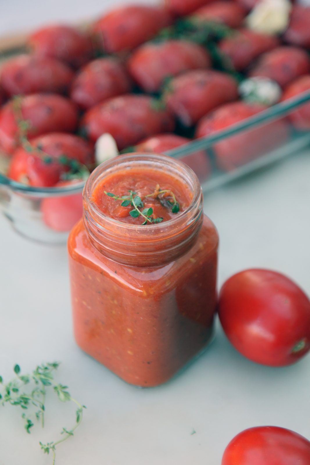 - Ψήνουμε τις ντομάτες σε προθερμασμένο φούρνο, στους 180°C για μισή ώρα περίπου, μέχρι να αρχίσουν οι φλούδες να παίρνουν χρώμα. Βγάζουμε το ταψί από το φούρνο και αφαιρούμε προσεκτικά τις φλούδες από τις ντομάτες, το σκόρδο και το θυμάρι.
