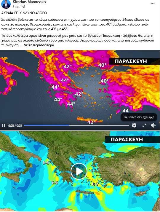 Παρασκευή και Σάββατο θα είναι οι πιο δύσκολες μέρες του καύσωνα, με τους μετεωρολόγους να κάνουν λόγο ακόμα και για 45 βαθμούς Κελσίου σε ορισμένες περιοχές της χώρας. «Το διήμερο Παρασκευή – Σάββατο θα μπει η χώρα μας σε ακραίο κίνδυνο τόσο από πλευράς θερμοκρασιών όσο και από πλευράς κινδύνου πυρκαγιάς» αναφέρει σε ανάρτησή του ο Κλέαρχος Μαρουσάκης.
