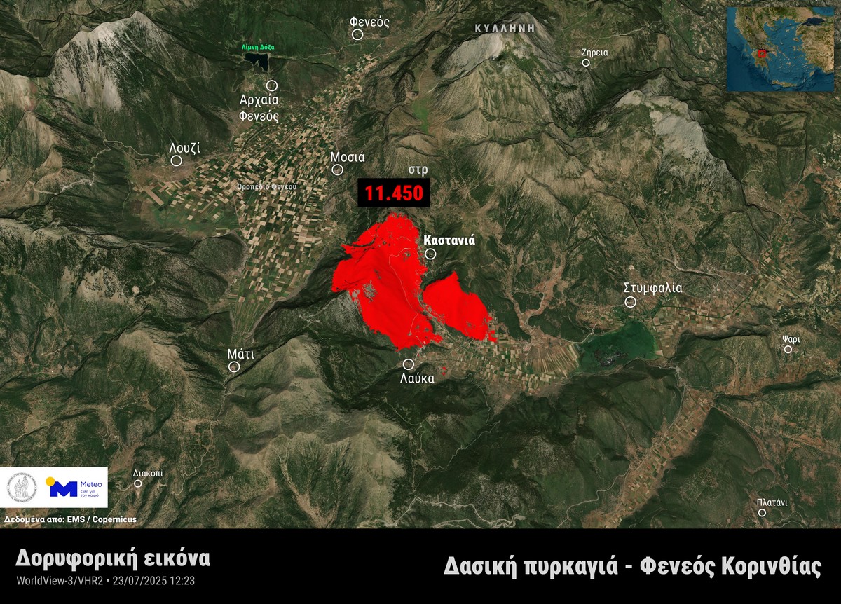 Δορυφορικά δεδομένα πολύ υψηλής ανάλυσης από τον δορυφόρο WorldView-3 (αισθητήρας VHR2) που πέρασε πάνω από την περιοχή το μεσημέρι της Τρίτης 23 Ιουλίου 2025 και επεξεργάστηκε η ομάδα του meteo.gr / Εθνικού Αστεροσκοπείου Αθηνών, αποκαλύπτουν την έκταση της περιοχής που επλήγη από τη μεγάλη δασική πυρκαγιά στον Φενεό Κορινθίας.