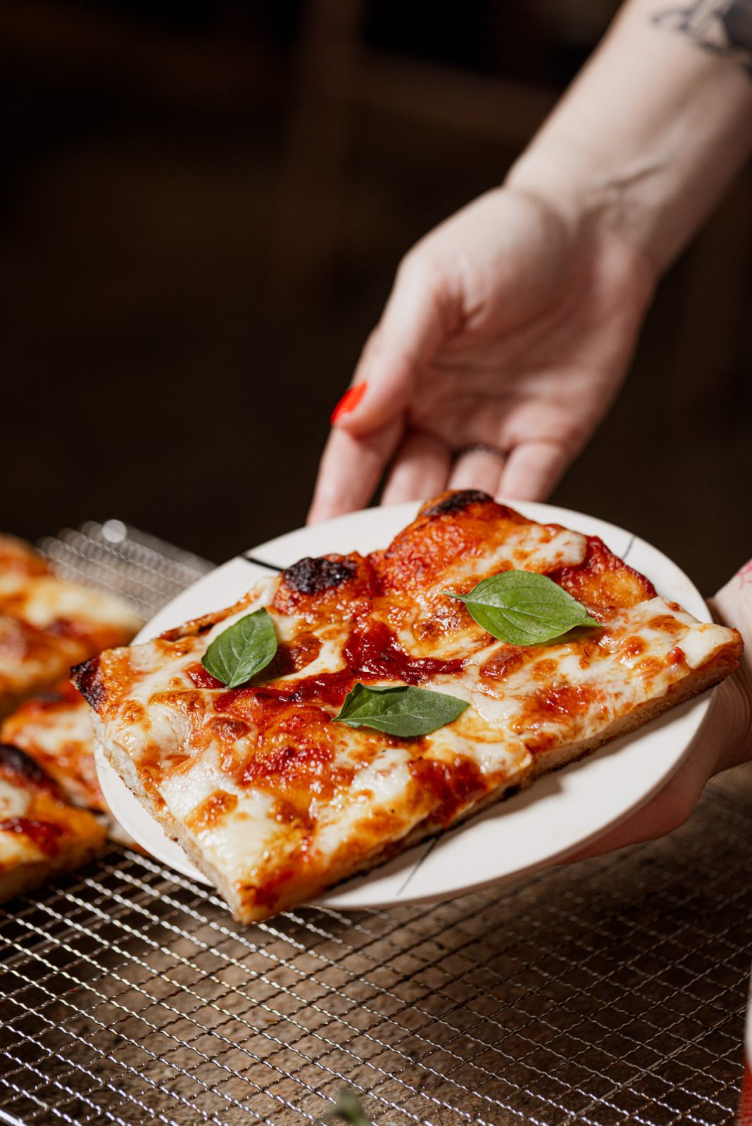 - Ψήνουμε την πίτσα σε καλά προθερμασμένο φούρνο στους 250°C, για 10 λεπτά ή μέχρι να ροδίσει η επιφάνειά της και να γίνει τραγανή. Αφαιρούμε το ταψί από το φούρνο, προσθέτουμε τη μοτσαρέλα και συνεχίζουμε το ψήσιμο για 5 λεπτά ακόμα, να λιώσει το τυρί. Γαρνίρουμε με φυλλαράκια φρέσκου βασιλικού και σερβίρουμε αμέσως.
