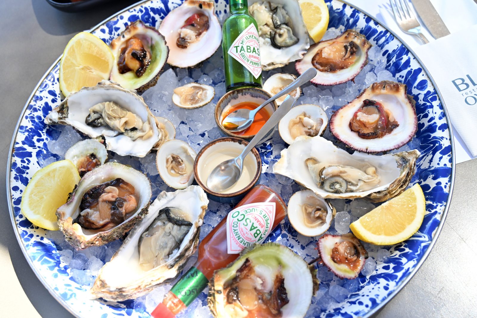 Στη μαγευτική παραλία του Αμπελά, κοντά στη Νάουσα της Πάρου, το Blue Oyster που δημιούργησαν ο Γιάννης Τσαχπίνης και η Μαργαρίτα Ευαγγελοπούλου είναι στην ουσία ένα seafood bar με βαρύτητα στην εκλεκτή πρώτη ύλη, στα κοκτέιλ και στα κρασιά από Έλληνες παραγωγούς υψηλού επιπέδου. Το μενού εστιάζει αποκλειστικά σε φρέσκα τοπικά προϊόντα· τα θαλασσινά φτάνουν κάθε πρωί από τα αλιευτικά του νησιού.