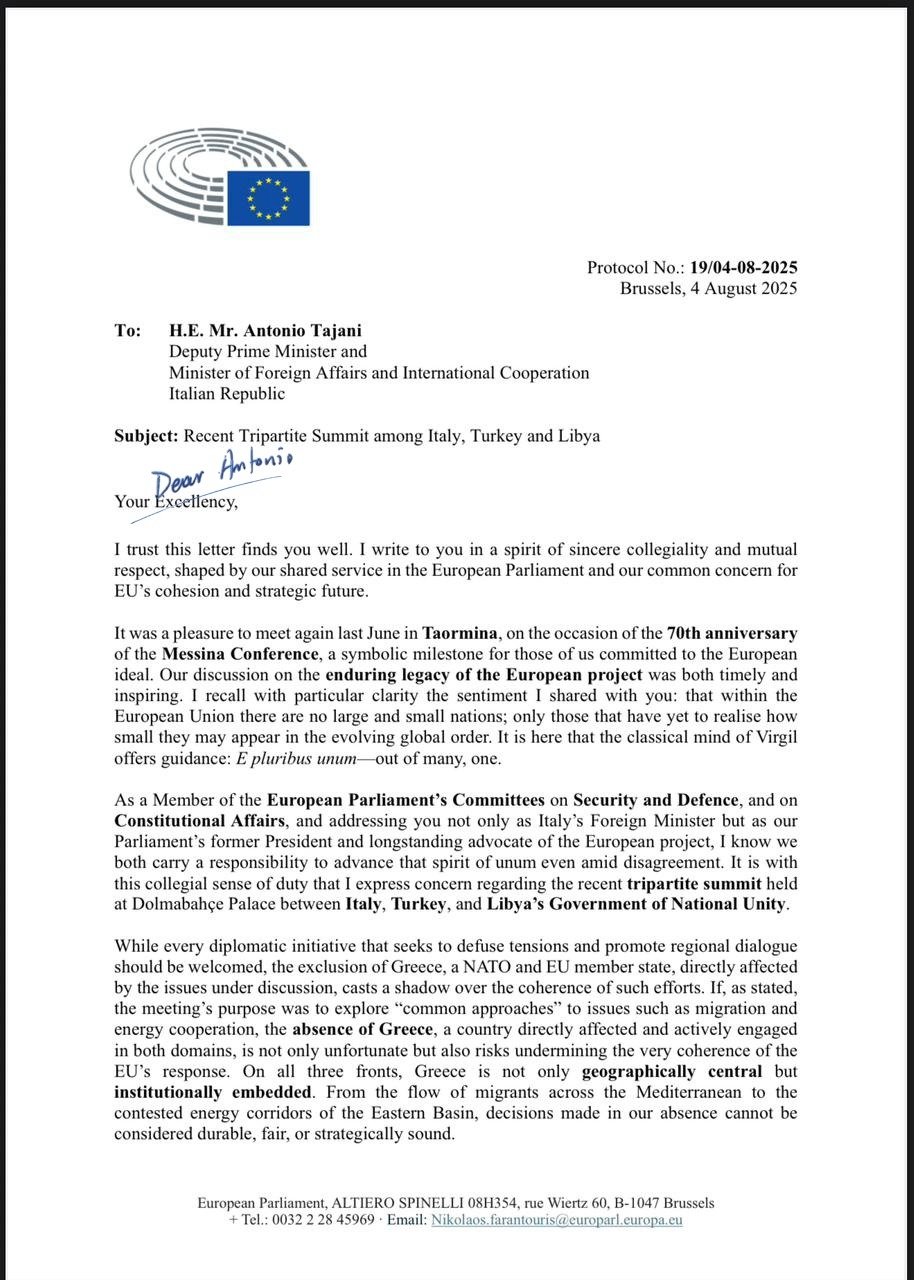 Στον αντιπρόεδρο και υπουργό Εξωτερικών της ιταλικής κυβέρνησης, Αντόνιο Ταγιάνι, απευθύνθηκε ο ευρωβουλευτής Νικόλας Φαραντούρης, εκφράζοντας την έντονη αντίδρασή του για την τριμερή Ιταλίας -Τουρκίας – Λιβύης στην Κωνσταντινούπολη. Όπως επισημαίνει σε επιστολή του ο Κεφαλλονίτης καθηγητής, «η Ελλάδα αγνοήθηκε και αυτό δεν μπορεί να περάσει απαρατήρητο», καθώς «Ελλάδα και Ιταλία έχουν κοινές στρατηγικές προκλήσεις».