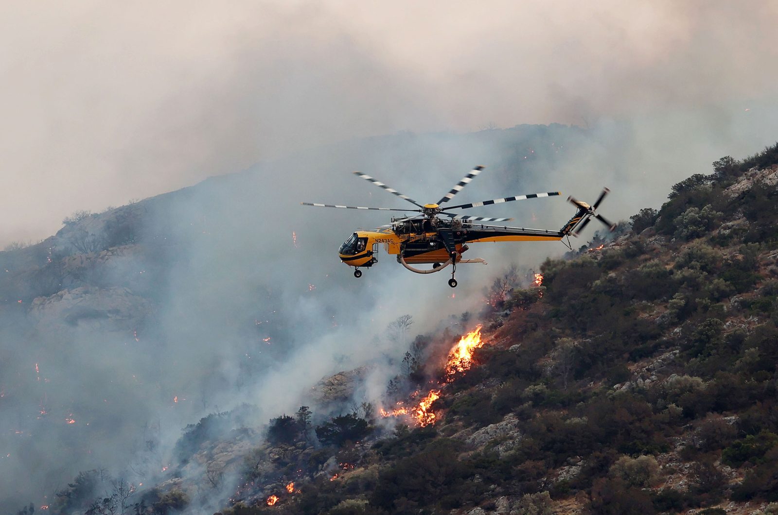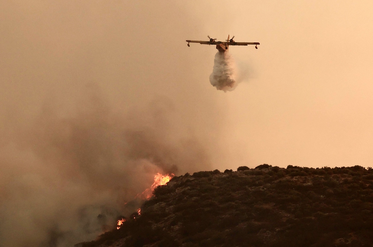 Πετώντας μέσα σε πυκνά σύννεφα καπνού και την ώρα που έσβηνε το τελευταίο φως της ημέρας, αεροπλάνα και ελικόπτερα επιχείρησαν για τελευταία φορά πάνω από το τεράστιο πύρινο μέτωπο των 7 χιλιομέτρων. Όπως μαρτυρούν οι δραματικές εικόνες, ένα τόξο φωτιάς έχει κυκλώσει την περιοχή σ’ ένα πολλαπλό, εκτεταμένο κι ανεξέλεγκτο πεδίο που έχει αφήσει πίσω του έναν νεκρό και καμένα σπίτια.
