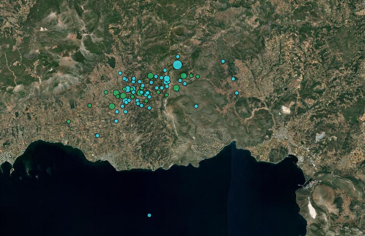Στη φωτογραφία που μπορείτε να δείτε ακριβώς από πάνω βλέπετε τους σεισμούς που έχουν σημειωθεί στην περιοχή τις τελευταίες επτά ημέρες.