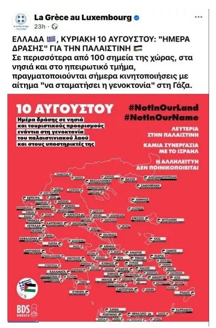 Ειδικότερα σε απάντηση της Εκπροσώπου του Υπουργείου Εξωτερικών, Λάνας Ζωχιού, σε ερώτηση δημοσιογράφου σχετικά με ανάρτηση στον επίσημο λογαριασμό Μέσου Κοινωνικής Δικτύωσης της Πρεσβείας της Ελλάδας στο Λουξεμβούργο, επισημαίνονται τα εξής: