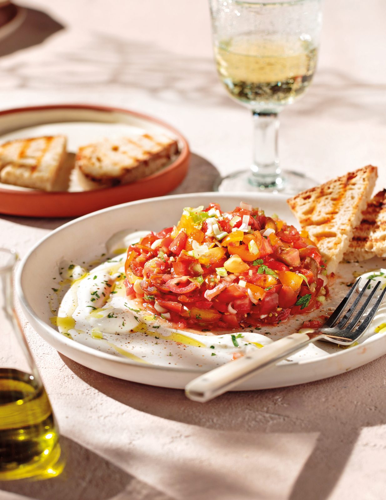 Πολύχρωμο ταρτάρ από ντοματίνια με άρωμα γεμιστών, κρέμα φέτας και ζυμωτό ψωμί
