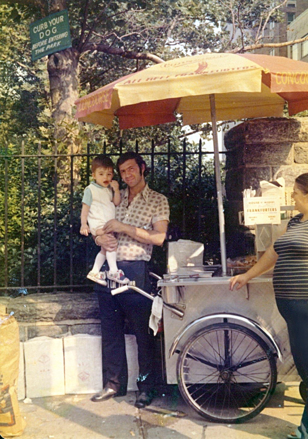 Ο Ανδρέας Καλαμπιάκος εργάστηκε για κάποια χρόνια πουλώντας χοτ ντογκ και κρατά στην αγκαλιά του τον γιο του Γιάννη.