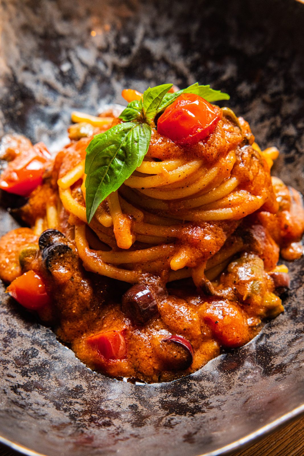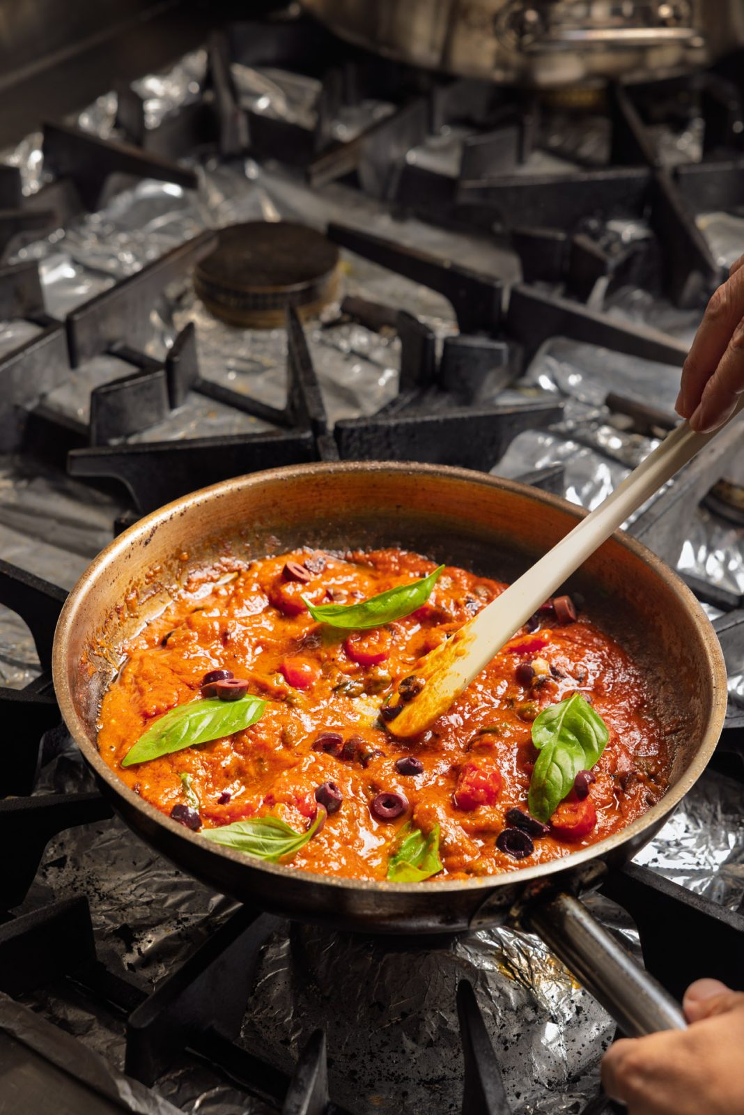 «Σε αυτή την κλασική συνταγή κάποιοι προσθέτουν τις αντζούγιες και κάποιοι όχι. Επίσης, στην puttanesca χρησιμοποιούμε σκόρδο, αλλά και βασιλικό, ο οποίος μπαίνει πάντα από πάνω», μας λέει ο Τζιοβάνι Σκαράτζι, που μπορεί να μη σερβίρει τη διάσημη σάλτσα στο εστιατόριό του, το Sole Giaguaro των Άνω Πετραλώνων, αλλά τη μαγειρεύει συχνά πυκνά για τη δική του απόλαυση, όπως τη μαγείρεψε και για μας.