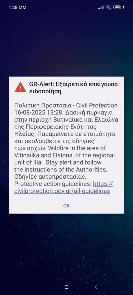 Λόγω της επικινδυνότητας της κατάστασης, το 112 ήχησε στα κινητά των κατοίκων, καλώντας τους να παραμείνουν σε ετοιμότητα και να ακολουθούν πιστά τις οδηγίες των Αρχών. Το μήνυμα αφορά τις περιοχές Βυτιναίικα και Ελαιώνας, όπου οι κάτοικοι ενημερώνονται να είναι σε εγρήγορση.