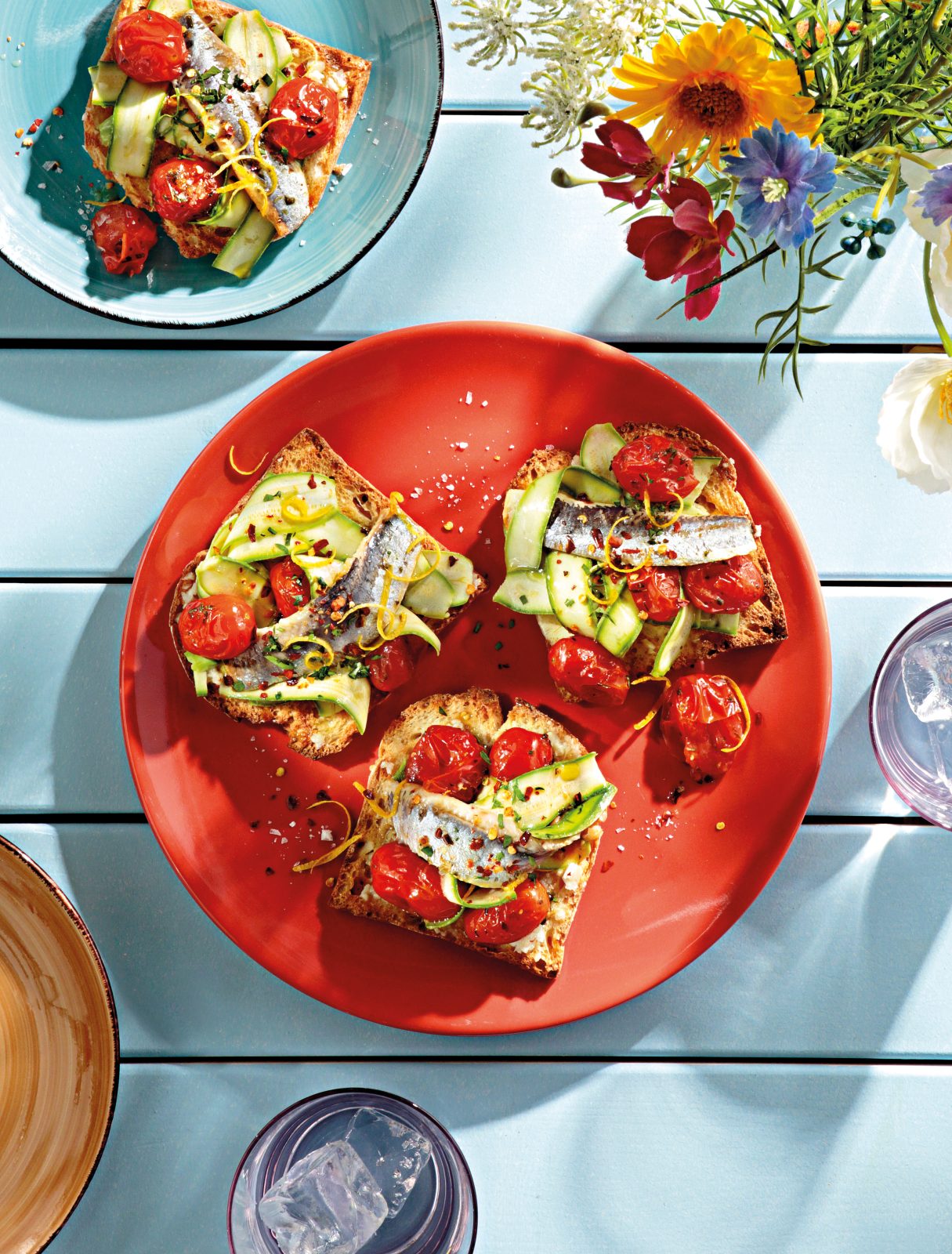 - Αλείφουμε τις φρυγανισμένες φέτες ψωμιού με το λιωμένο σκόρδο και μοιράζουμε στην επιφάνειά τους τα κολοκυθάκια, τις σαρδέλες και τα γλασαρισμένα ντοματίνια.