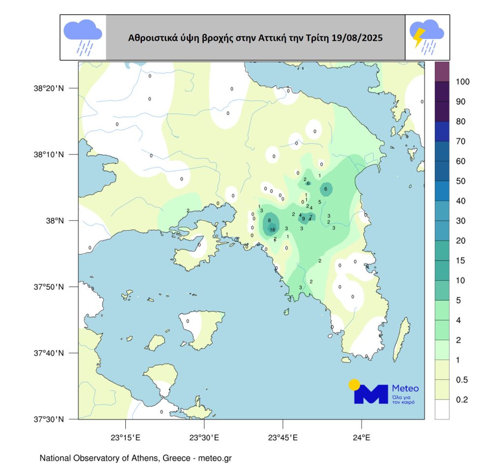 Στον χάρτη που ακολουθεί παρουσιάζεται η κατανομή της βροχόπτωσης στην Αττική από τους 93 σταθμούς του δικτύου αυτόματων μετεωρολογικών σταθμών του Εθνικού Αστεροσκοπείου Αθηνών / meteo.gr στην ευρύτερη περιοχή.