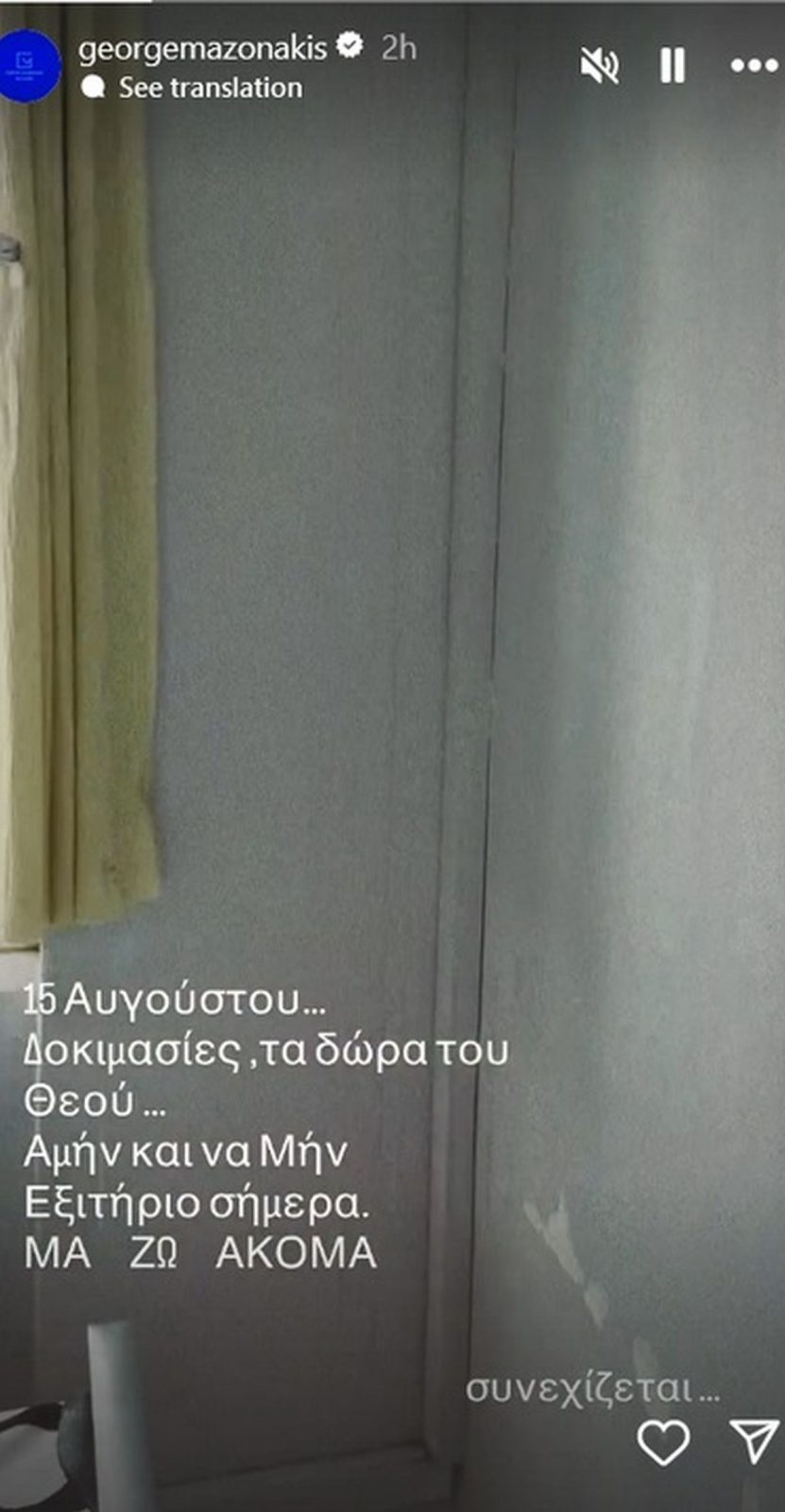 Ο ίδιος έγραψε στο βίντεο που ανέβασε, το οποίο τράβηξε την Παρασκευή 15 Αυγούστου: «15 Αυγούστου… Δοκιμασίες, τα δώρα του Θεού. Αμήν και να μην. Εξιτήριο σήμερα. Μα ζω ακόμα. Συνεχίζεται…», θέλοντας και πάλι να στείλει το δικό του μήνυμα.