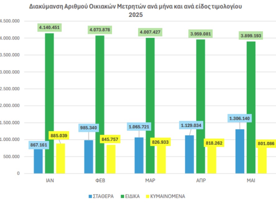 Δηλαδή περισσότεροι από 438.000 καταναλωτές άφησαν τα «πράσινα» και τα «κίτρινα» τιμολόγια ρεύματος αναζητώντας τη σταθερότητα στις χρεώσεις των λογαριασμών. Πάντως η συντριπτική πλειοψηφία των καταναλωτών ρεύματος, 3.899.193 παροχές, παραμένουν στα «πράσινα» τιμολόγια, ενώ στα κίτρινα τιμολόγια απαριθμούνται 801.086 παροχές.