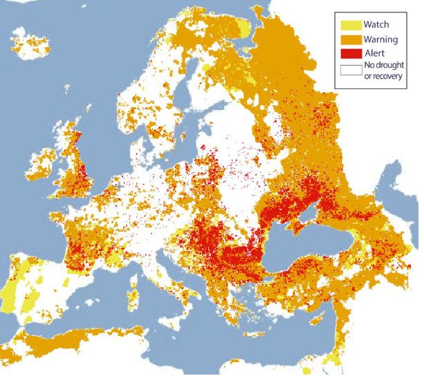Βελτίωση παρατηρείται μόνο στην κεντρική Ευρώπη. Η υγρασία του εδάφους και οι συνθήκες βλάστησης επιστρέφουν στο φυσιολογικό στη Γερμανία, την Ελβετία, την Αυστρία και την Τσεχία, οι οποίες όμως είχαν πληγεί περισσότερο από την ξηρασία τους προηγούμενους μήνες.