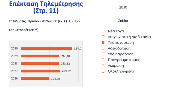 - Λοιπά έργα δικτύου με 25 επενδυτικά σχέδια ύψους 1,7 δισ. ευρώ. Τα 1,4 δισ. ευρώ κατευθύνονται στους έξυπνους μετρητές.