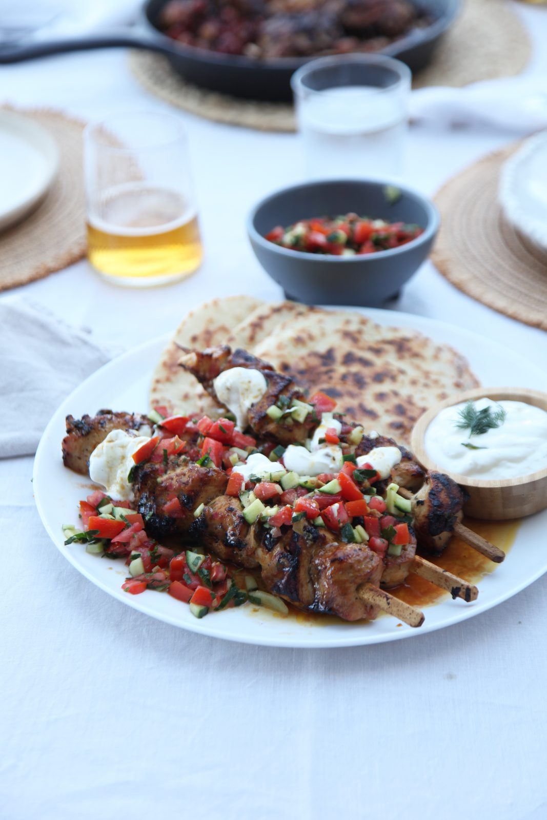 Σουβλάκια κοτόπουλο με αρωματικό γιαούρτι, σαλάτα και εύκολες πιτούλες