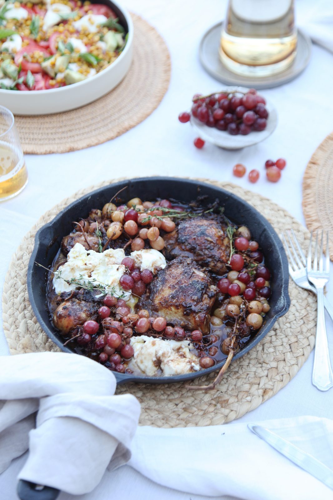 - Επαναφέρουμε το κοτόπουλο στο τηγάνι και το μεταφέρουμε στο φούρνο. Ψήνουμε για 15 λεπτά, προσθέτουμε τα σταφύλια και συνεχίζουμε το ψήσιμο για 15 λεπτά ακόμα.