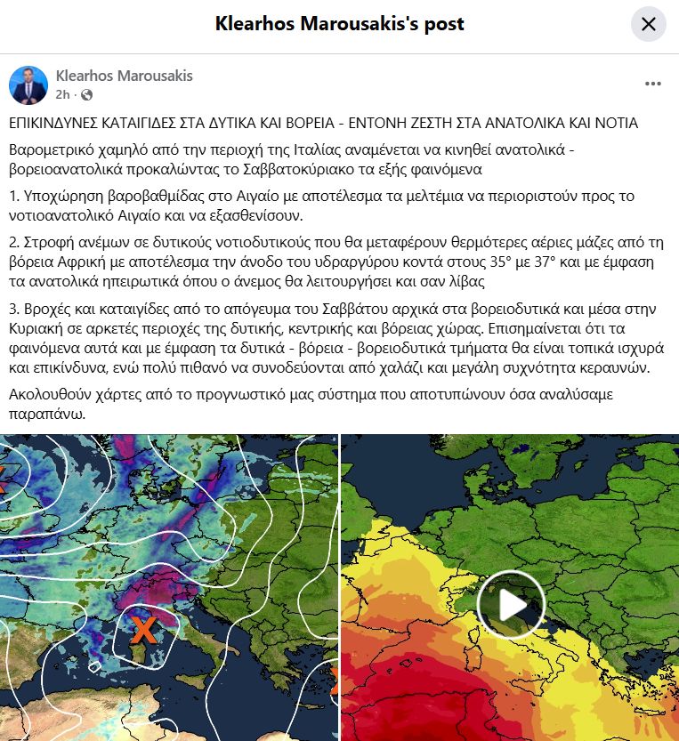 Ραγδαία αλλαγή αναμένεται να παρουσιάσει ο καιρός το Σαββατοκύριακο. Σύμφωνα με την τελευταία πρόγνωση του μετεωρολόγου Κλέαρχου Μαρουσάκη, το βαρομετρικό χαμηλό που πλησιάζει από την περιοχή της Ιταλίας, φέρνει επικίνδυνες καταιγίδες από το απόγευμα του Σαββάτου.