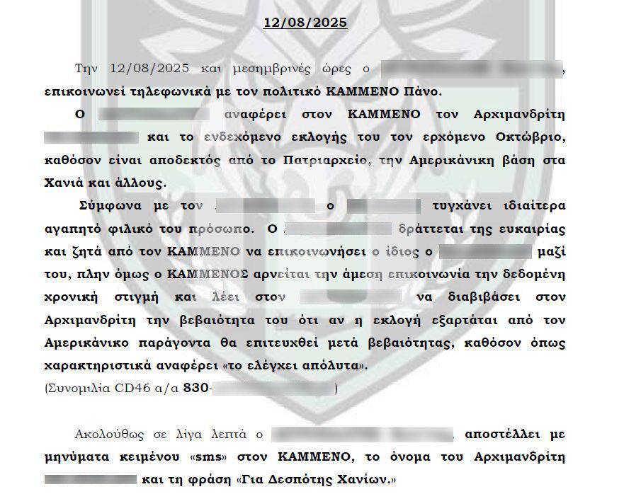 - Στις 12 Αυγούστου, ο ξενοδόχος επικοινωνεί τηλεφωνικά με τον Πάνο Καμμένο. Του μιλάει για τον αρχιμανδρίτη και υποστηρίζει ότι είναι αποδεκτός από το Πατριαρχείο, την Αμερικάνικη βάση στα Χανιά και άλλους. Δεν παραλείπει να επισημάνει στον κ. Καμμένο ότι ο αρχιμανδρίτης είναι ιδιαίτερα αγαπητό, φιλικό του πρόσωπο. Μάλιστα, δράττεται της ευκαιρίας και ζητά από τον πρώην υπουργό να επικοινωνήσει ο ίδιος ο αρχιμανδρίτης μαζί του, πλην όμως ο κ. Καμμένος αρνείται την άμεση επικοινωνία την δεδομένη χρονική στιγμή και λέει στον κατηγορούμενο ξενοδόχο να διαβιβάσει στον Αρχιμανδρίτη τη βεβαιότητά του ότι αν η εκλογή εξαρτάται από τον αμερικάνικο παράγοντα θα επιτευχθεί μετά βεβαιότητας, καθόσον, όπως χαρακτηριστικά αναφέρει, «το ελέγχει απόλυτα». Λίγα λεπτά αργότερα, ο κατηγορούμενος στέλνει μήνυμα στον Πάνο Καμμένο με το όνομα του αρχιμανδρίτη και τη φράση «για δεσπότης Χανίων». Ο κατηγορούμενος ως εγκέφαλος της κρητικής μαφίας επικοινωνεί στη συνέχεια με τον αρχιμανδρίτη και του μεταφέρει τις διαβεβαιώσεις Καμμένου.