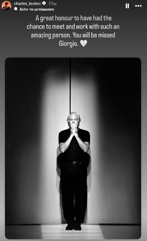 Μέσα από ένα στόρι στο Instagram ο οδηγός της Formula 1, αποχαιρέτησε τον Giorgio Armani, το οποίο αποτελούταν από μία φωτογραφία του σχεδιαστή και τα εξής λόγια: «Ήταν μεγάλη τιμή που είχα την ευκαιρία να γνωρίσω και να συνεργαστώ με έναν τόσο καταπληκτικό άνθρωπο. Θα μας λείψεις, Τζιόρτζιο».