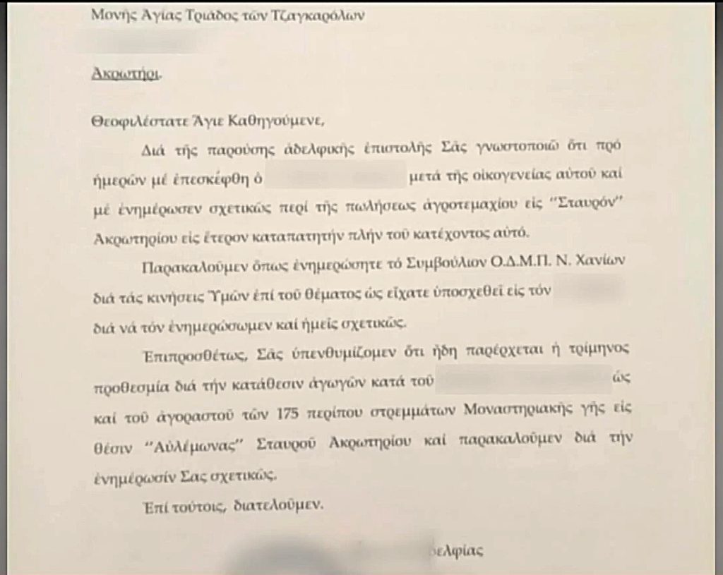 H δεύτερη δικογραφία αφορά στην αγοραπωλησία των 175 στρεμμάτων της Ιεράς Μονής στην περιοχή του Σταυρού Ακρωτηρίου. Την έκταση αγόρασε ισραηλινός όμιλος μέσω ενός εκ των κατηγορουμένων, με τη «σφραγίδα» του τότε επισκόπου, που κατηγορείται, επίσης, μαζί με το δικηγόρο που συμμετείχε στην αγοραπωλησία.