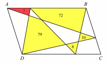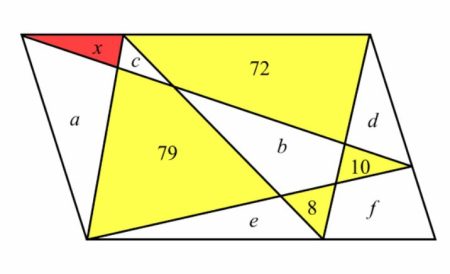 Στην εικόνα παρατηρούμε δυο τέτοια τρίγωνα: Το ένα συντίθεται από τις επιφάνειες a, 79, b, 10 με συνολική επιφάνεια (α + 79 +b +10) και στην άλλη περίπτωση έχουμε δυο τρίγωνα, με επιφάνειες (x+α) και (72+b+8) με βάσεις σε μια από τις δυο μεγαλύτερες πλευρές και κορυφές στην απέναντι πλευρά. Το άθροισμα των επιφανειών και των δυο αυτών τριγώνων( (x+α), (72+b+8)) είναι επίσης ίσο με το μισό του εμβαδού του παραλληλογράμμου(διότι οι βάσεις τους συνολικά έχουν μήκος όσο η μια πλευρά και ύψος το ύψος του παραλληλογράμμου). Εξισώνουμε επομένως τις επιφάνειες: